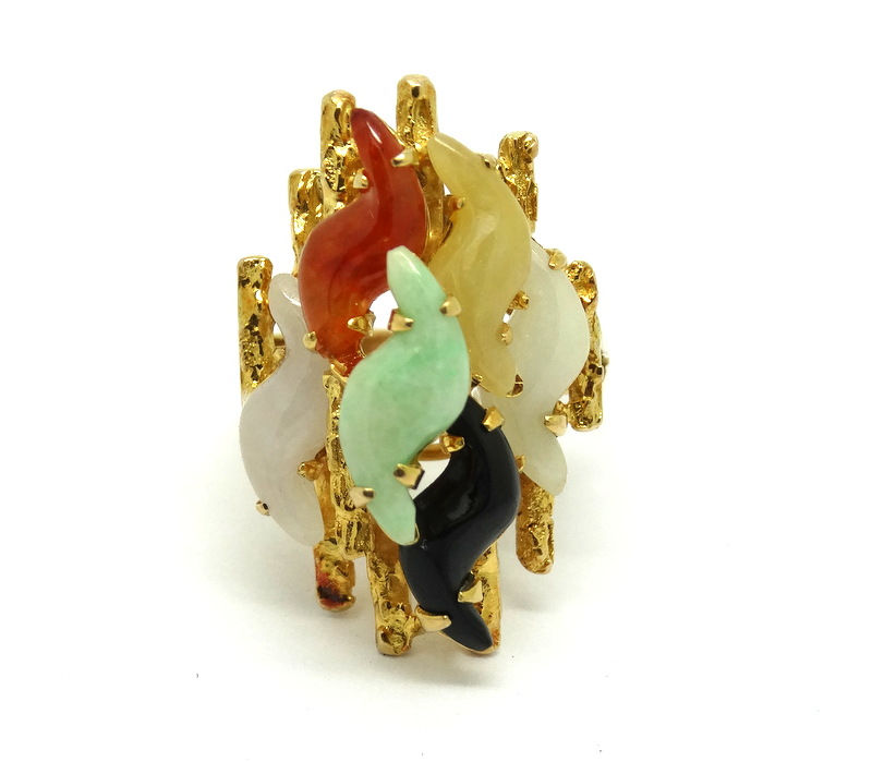 Modernist Chinese Multi Color Wavy Carved JADE Jadeite 14k Gold Ring s.5